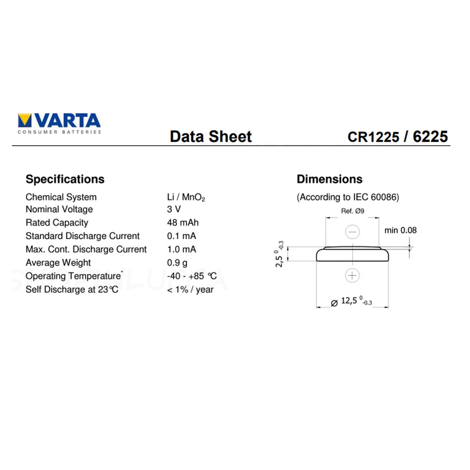 Le celle a bottone VARTA al litio progettate per fornire energia affidabile per i piccoli dispositivi elettronici. Batterie che offrono le massime prestazioni per applicazioni a impulsi e a scarica continua. Varta CR1225 è una batteria Litio non ricaricabile da 3V a lunga durata nel formato 1220 e conosciuta anche con i codici di altri produttori come 5020LC, L28BBB, GuardPLC, 1200, 1745, BAT, AWI, L09. Questa pila garantisce la qualità e l’energia ideale per l’applicazione su una vasta gamma di device di uso quotidiano, come piccoli giocattoli, calcolatrici e dispositivi di misurazione. Tutte le pile a bottone al litio VARTA soddisfano i più alti standard di sicurezza. Perfette per varie applicazioni di base e intelligenti come portachiavi, telecomandi, bilance, dispositivi domestici intelligenti e molti altri piccoli dispositivi elettronici. Migliore qualità e durata garantita.