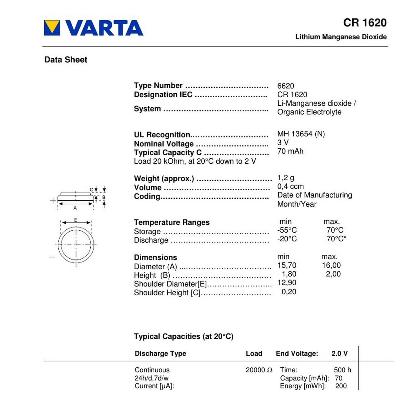 Le celle a bottone VARTA al litio progettate per fornire energia affidabile per i piccoli dispositivi elettronici. Batterie che offrono le massime prestazioni per applicazioni a impulsi e a scarica continua. Varta cr1620 è una batteria Litio non ricaricabile da 3V a lunga durata nel formato 1620 e conosciuta anche con i codici di altri produttori come 5009LC, 280-208 e L08. Questa pila garantisce la qualità e l’energia ideale per l’applicazione su una vasta gamma di device di uso quotidiano, come piccoli giocattoli, calcolatrici e dispositivi di misurazione. Tutte le pile a bottone al litio VARTA sono confezionate a prova di bambino (tecnologia Baby Secure) e soddisfano i più alti standard di sicurezza. Perfette per varie applicazioni di base e intelligenti come portachiavi, telecomandi, bilance, dispositivi domestici intelligenti e molti altri piccoli dispositivi elettronici. Migliore qualità e durata garantita.